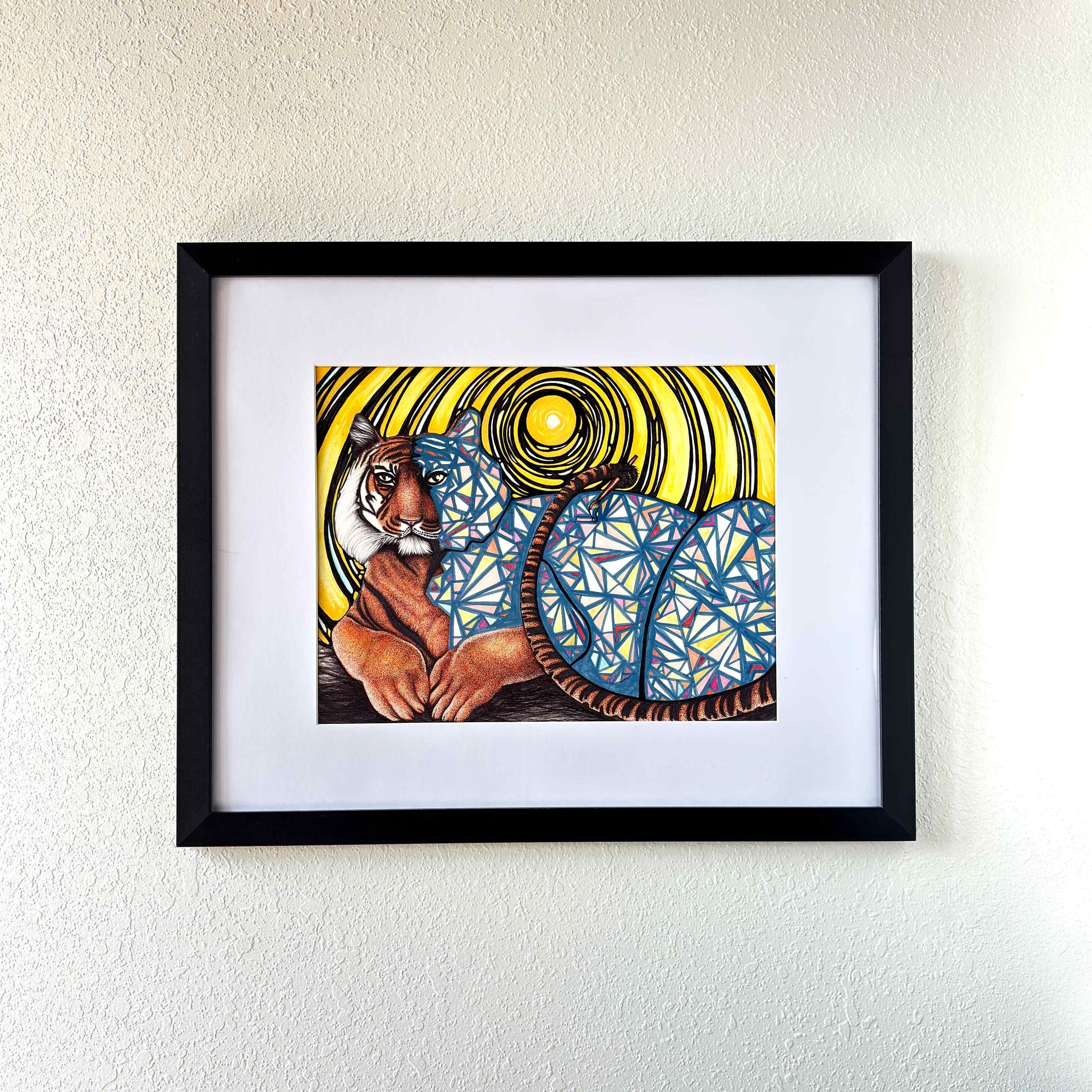 The Tiger Changes Her Stripes is an 11”X14” original ink, watercolor, and acrylic painting signed by the artist. It has been mounted on an acid-free matte and framed in a 16”X20” wooden frame with a plexiglass front to keep it lightweight and durable for transport. Professionally shipped, packaged, and insured.