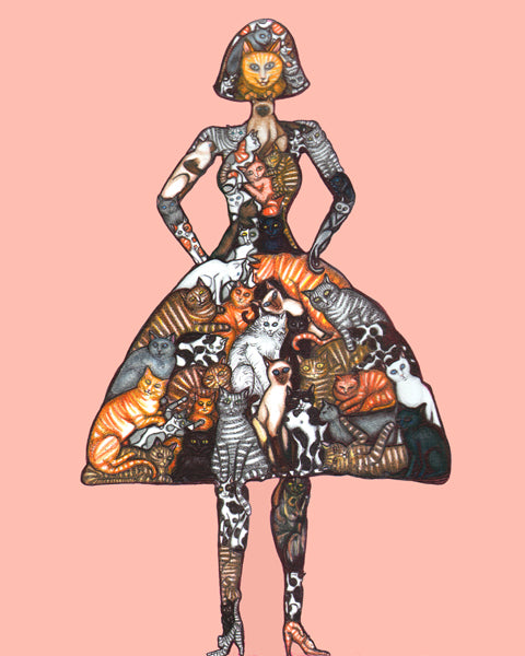 La Dama Gato es una reproducción giclée de archivo firmada de mi dibujo original en tinta y lápiz de color con un fondo coloreado digitalmente.